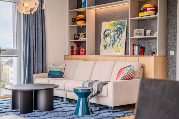 In diesem Interior-Design-Projekt spielt die Farbe Blau eine zentrale Rolle und verleiht dem Raum eine beruhigende und stilvolle Atmosphäre. Blau ist oft mit Ruhe und Gelassenheit verbunden, was in diesem Raum durch die gedeckten und sanften Töne unterstrichen wird. Petrol, eine Mischung aus Blau und Grün, bringt zusätzlich eine Tiefe und Raffinesse in den Raum. Somit entsteht eine moderne, aber dennoch behagliche Umgebung, die sowohl entspannend als auch visuell ansprechend ist.