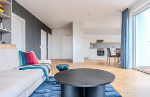 In Kombination mit den neutralen Holztönen und grauem Mobiliar trägt es zu einem ausgewogenen und harmonischen Gesamtbild bei. Es entsteht ein Gefühl von Klarheit und Ruhe, das gleichzeitig stilvoll und einladend wirkt.